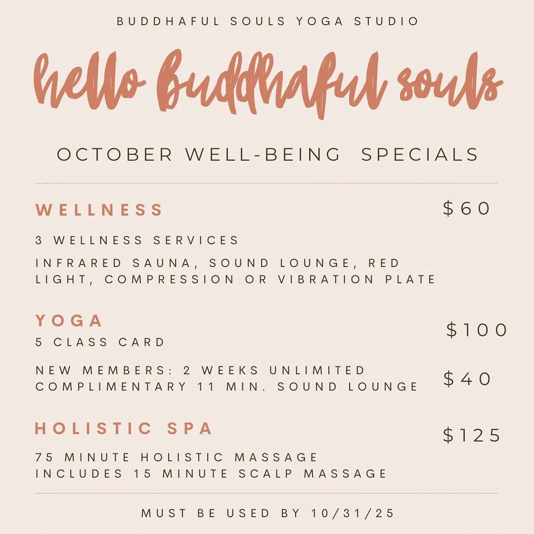 Whether you're rolling out your mat or tucking into a massage table, Buddhaful Souls is more than a studio it's a place to come home to yourself. To be supported. To feel whole. And to leave just a little more connected than when you arrived.